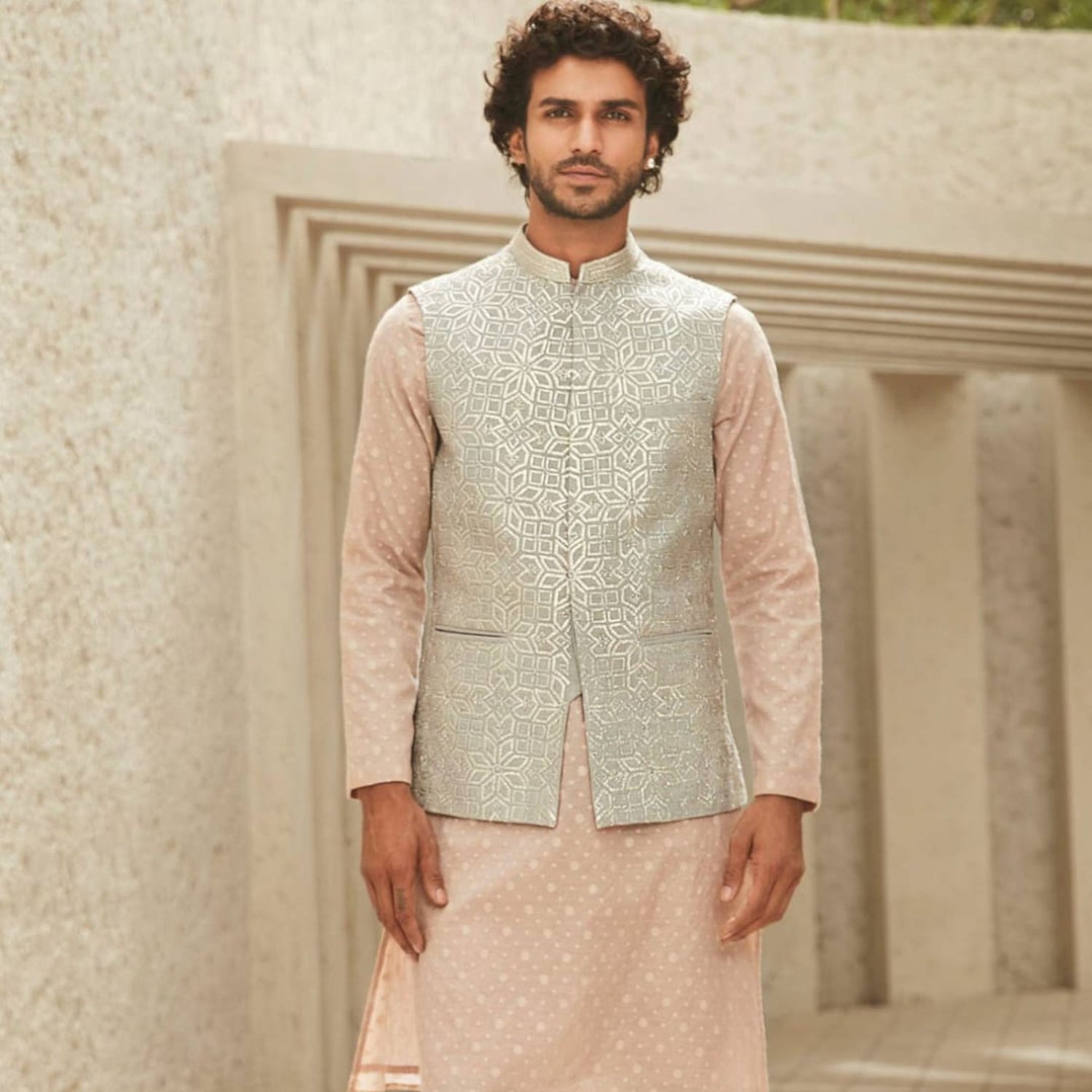 The Dusty Peach Jodhpuri set, crafted from luxurious silk fabric
