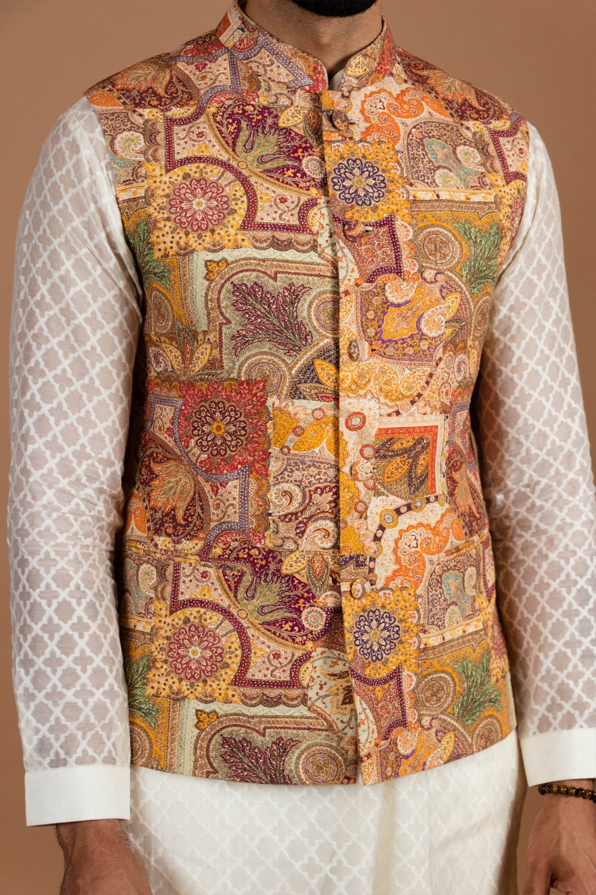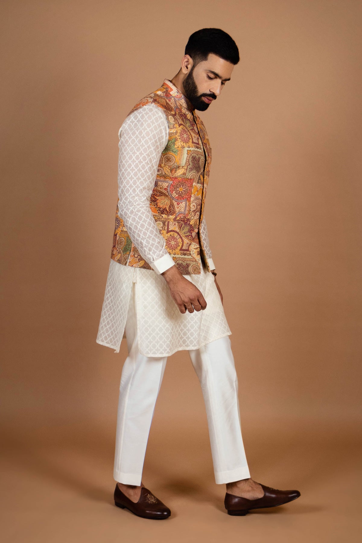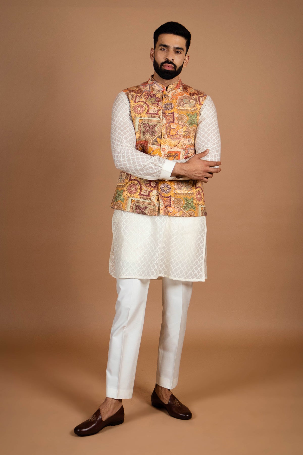 ● COLOUR: White Kurta Pyjama, Printed Jacket