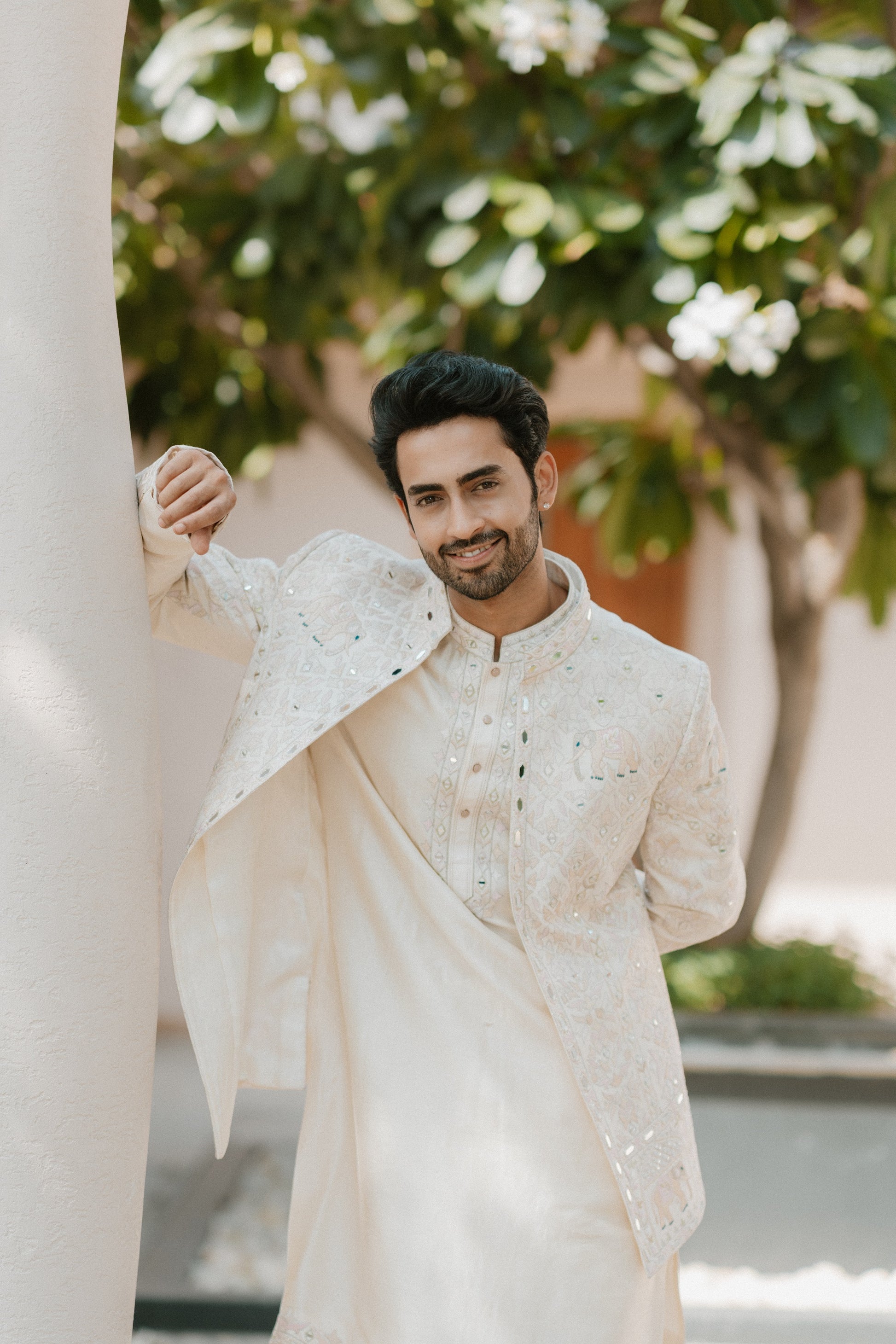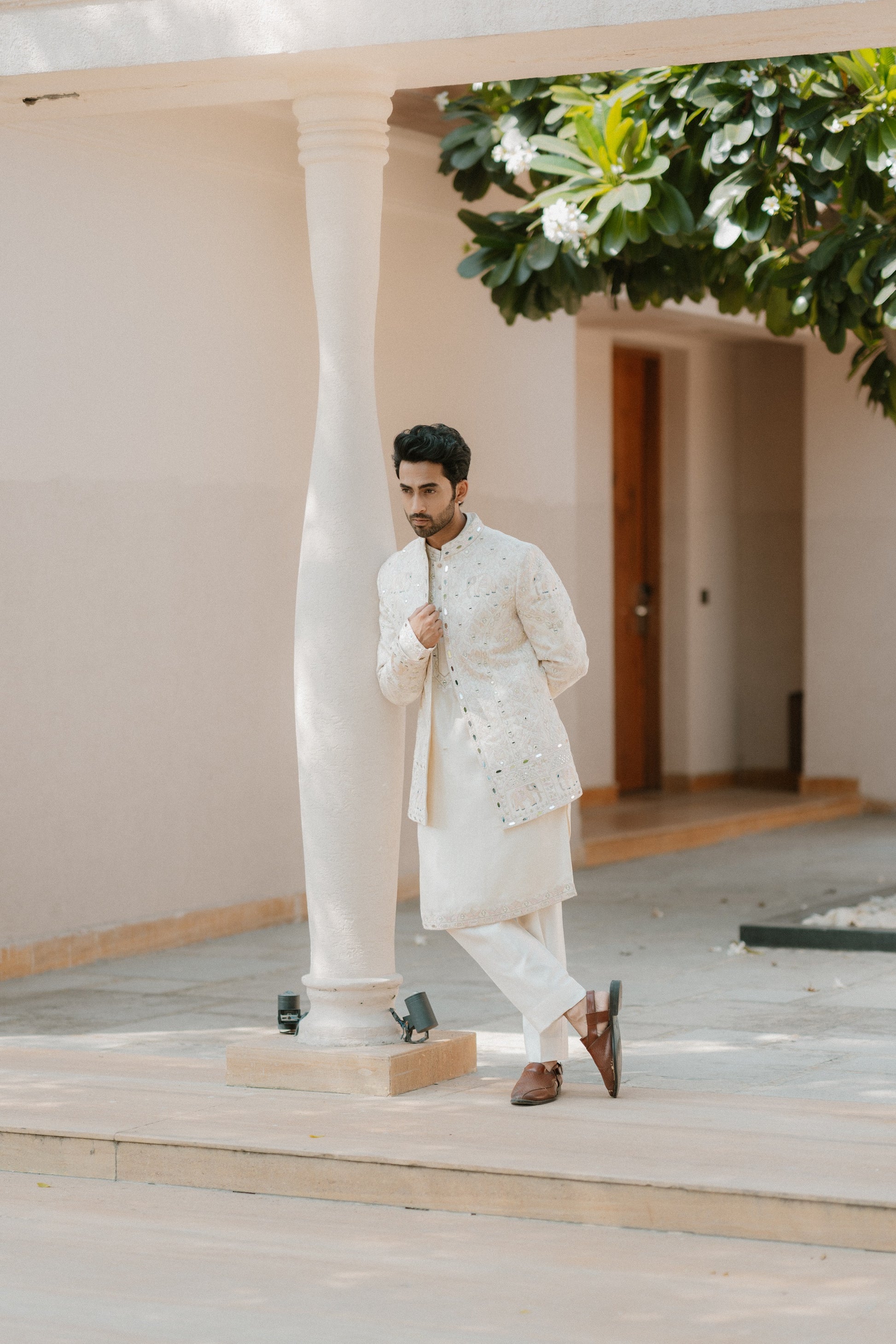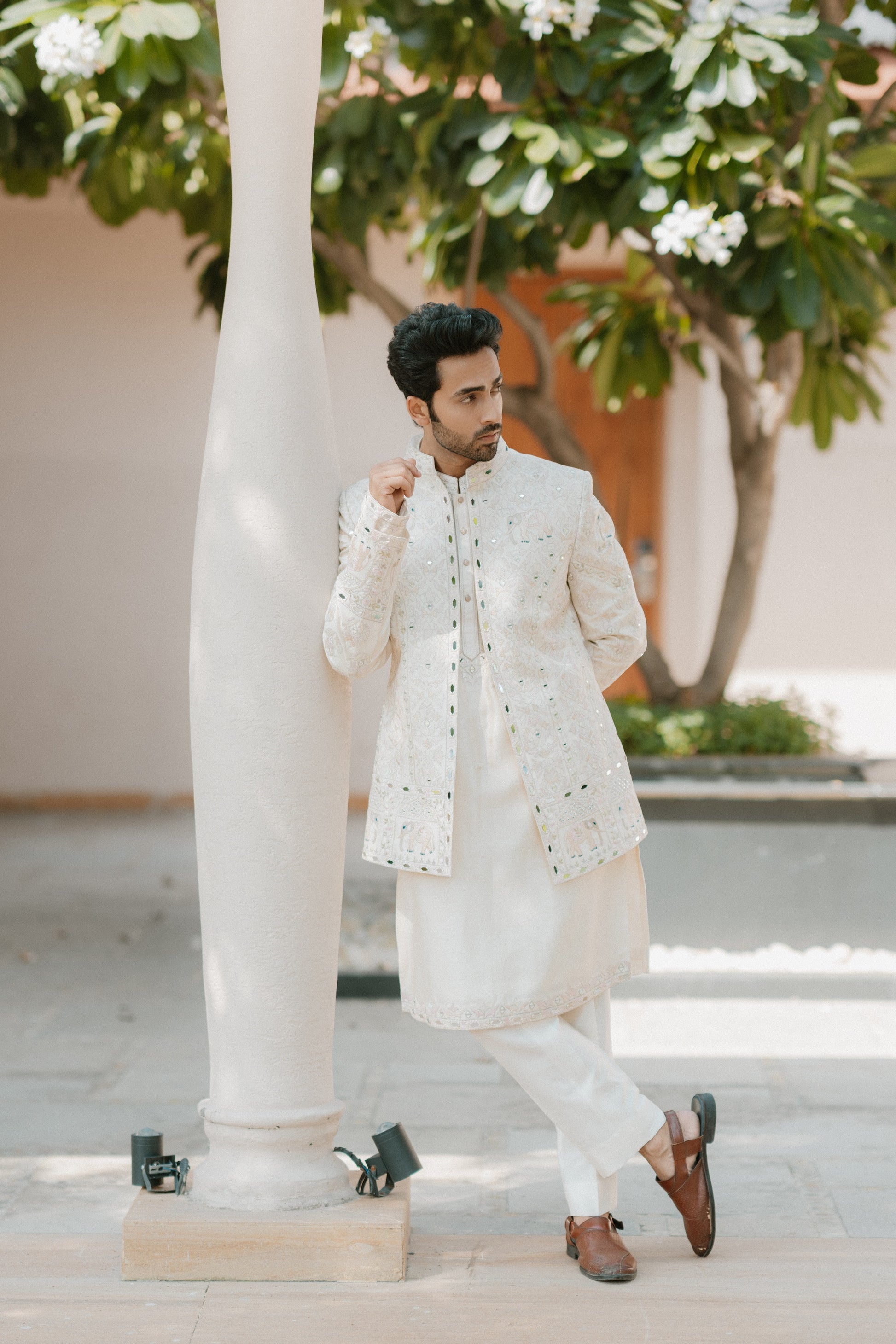 Elevate your traditional wardrobe with this Pure Silk Indo-Western Set in an elegant Ivory White tone. Crafted from luxurious silk, the ensemble features a finely tailored long jacket with intricate detailing, paired with a matching kurta and churidar pants. The subtle sheen of silk combined with the timeless ivory hue makes it a perfect choice for weddings, receptions, and festive occasions. Styled with classic brown leather footwear, this set exudes sophistication and royal charm.