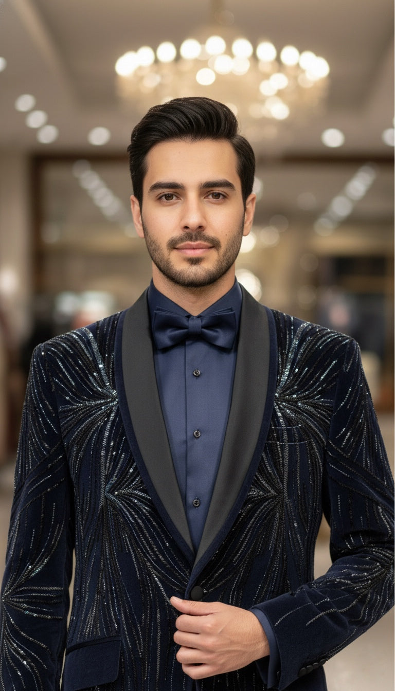 Crafted from rich Italian velvet, this tuxedo set features a finely textured surface that enhances depth, dimension, and visual sophistication. The dense velvet pile subtly shifts with light, creating a refined play of shadow rather than a flat or glossy appearance. This gives the garment a luxurious, elevated presence ideal for high-end formalwear. The fabric balances softness with tailored structure, allowing for sharp, sculpted lines while remaining comfortable to wear for long evening events. With its premium drape and plush hand-feel, this tuxedo is perfect for black-tie occasions, weddings, gala nights, and luxury celebrations where understated elegance is key.