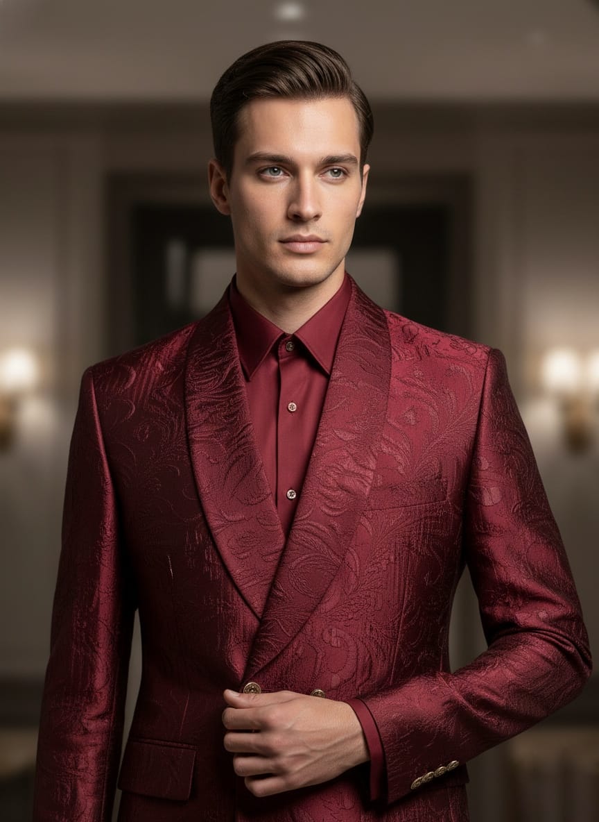 Elevate your formal style with this Wine Embroidered Two-Piece Suit, crafted from premium embroidered fabric with a subtle textured pattern. Designed for modern elegance, the tailored blazer pairs seamlessly with matching trousers, making it an ideal choice for weddings, receptions, cocktail parties, and luxury evening events. The rich wine tone adds a bold yet refined statement, perfect for standout occasions.