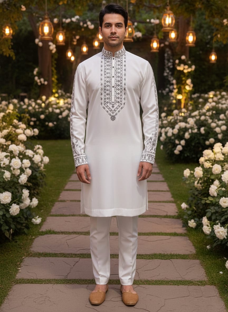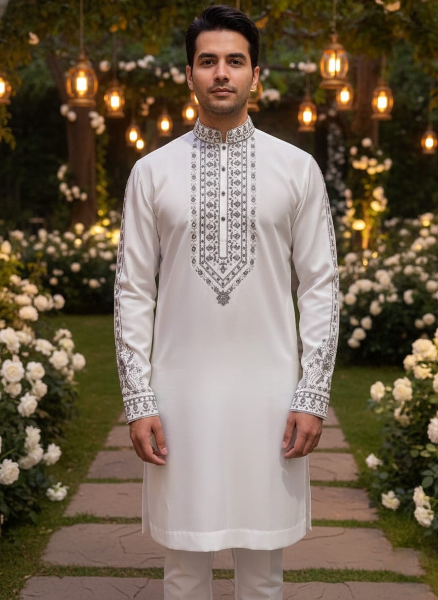 Embrace timeless tradition with this Ivory White Two-Piece Kurta Pajama Set, crafted from premium Italian fabric for a smooth, breathable, and refined finish. The kurta features elegant embroidery detailing on the neckline and sleeves, paired with a perfectly tailored pajama for all-day comfort. Ideal for weddings, festive occasions, and cultural celebrations, this ensemble reflects understated luxury and classic charm.